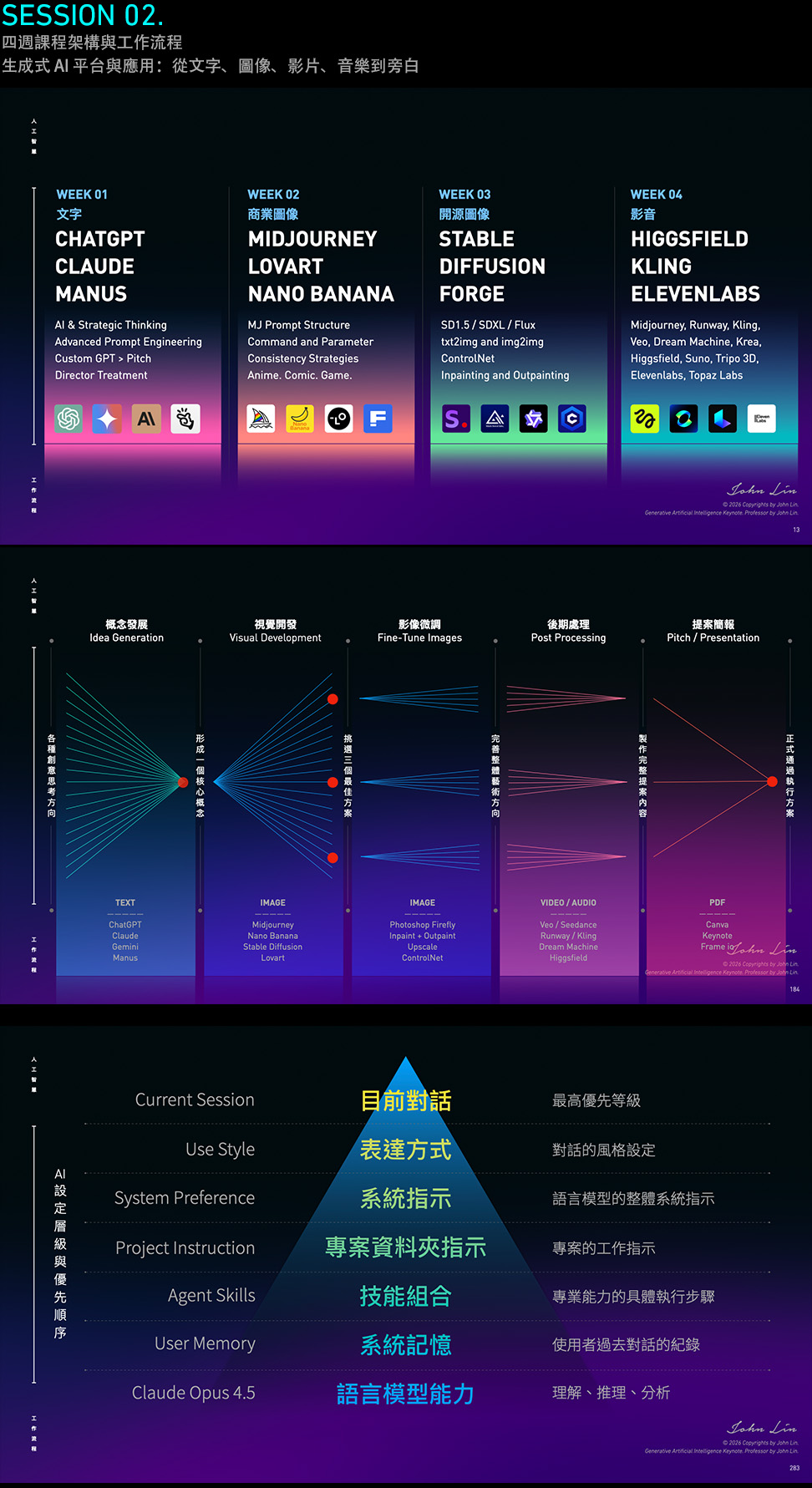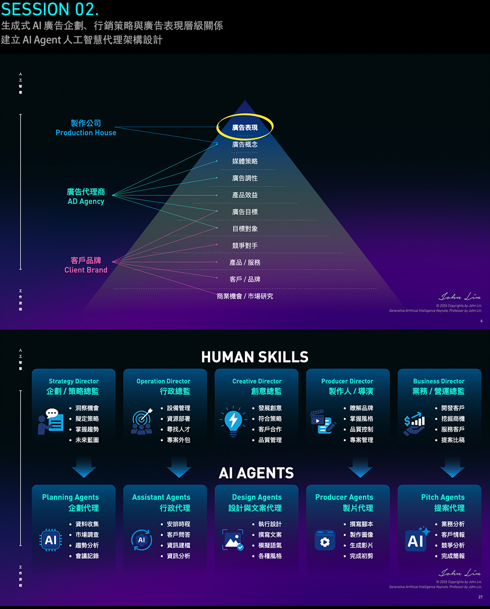 這個 AI 影像與製片工作流程的課程是 John 最新的人工智慧學習與探索心得,這門課致力於以系統化的方式進行教學,讓同學可以有效率的學習整個生成式 AI 家族在影像相關產業的應用藍圖。John 所發展出的課程,將會幫助每個學生在影像的專業領域上,展現成效並取得新的突破。這個課程將帶給您實質的成長,不僅能有效運用人工智慧,同時也能從中獲得許多關於未來職業與事業發展的新啓發
