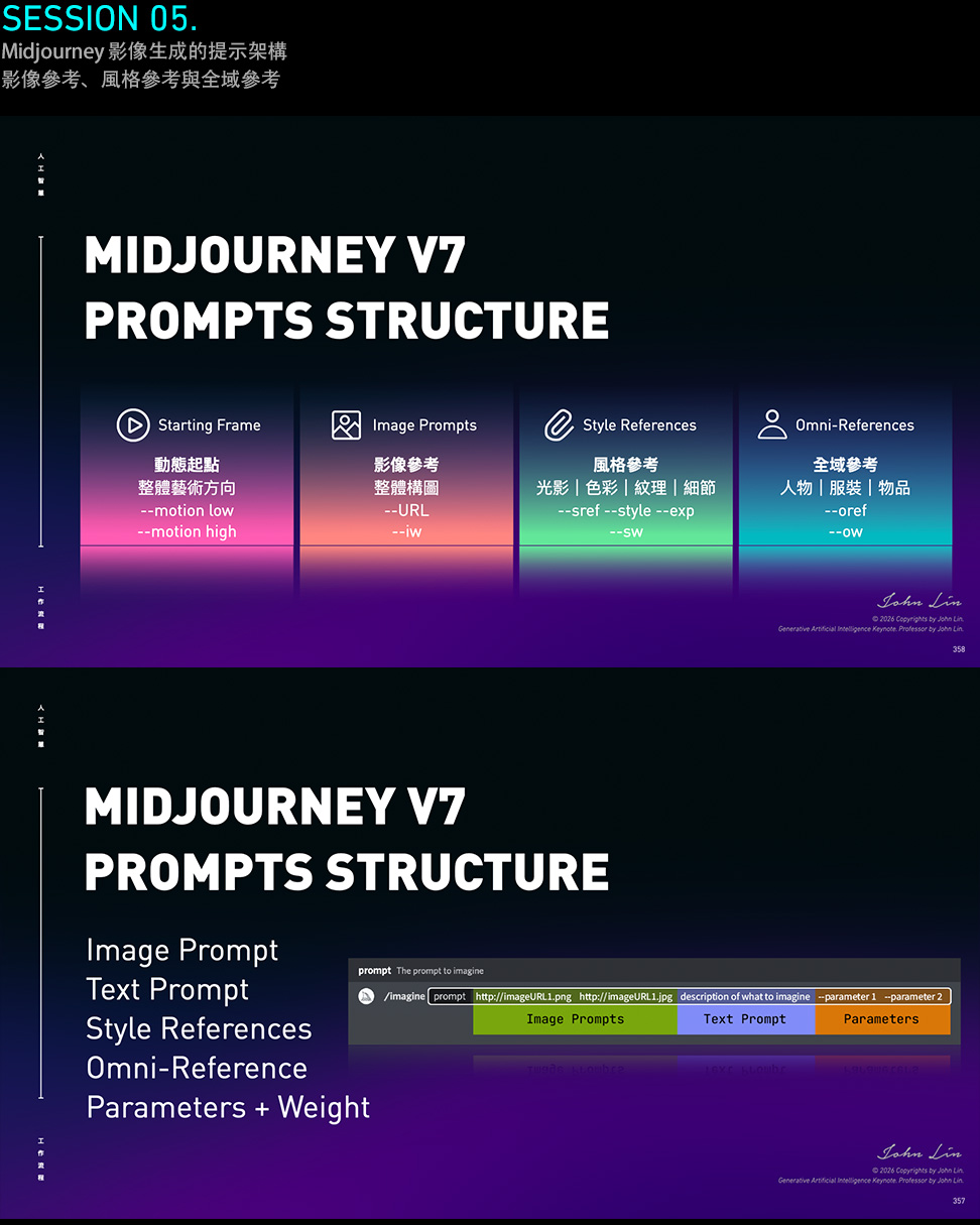 影像生成的文字提示架構:這是在 Midjourney 生成影像最關鍵的要素,對於所有影像工作者來說,遵循提示架構,將能夠準確地將創作想法轉化為實際影像,提示詞對於創意表現扮演最重要的角色,同時搭配:圖像提示、文字提示詞與風格參數,來精準控制影像生成的結果(目前 Midjourney 已經能支援中文提示詞)