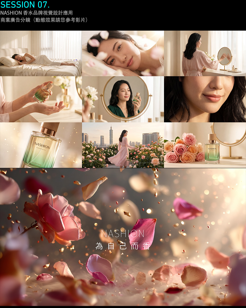 以上這段影片 "NASHION 為自己而香" 是我們在課程中用於講解 AI 生成技術的商業廣告範例,從最初的文字腳本開始,到分鏡圖像生成、影片動態、後期剪接、調光調色與音樂旁白的完整製作,整體的製作時間大約是 8 小時,雖然因為時間有限的關係,我們無法在這段影片中處理太多細節與瑕疵,但是相信同學在課程結束之後,透過我們展示的 AI 工作流程,您將可以使用相同的 AI 工具,以有效率的方式製作這樣的初級影片,並對人工智慧的影像生成技術建立基本慨念。如果您本身就是已經熟悉剪輯、特效、合成與調色軟體的專業影像工作者,那麼您在自己的專業領域運用 AI,必定能比我們以更有效率的方式完成更高品質的專案