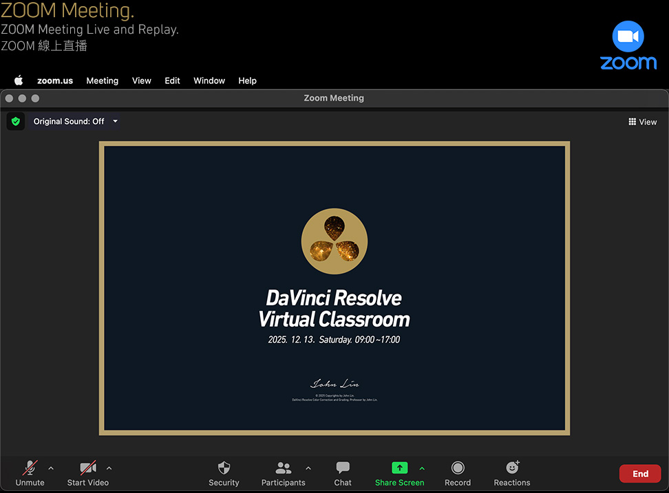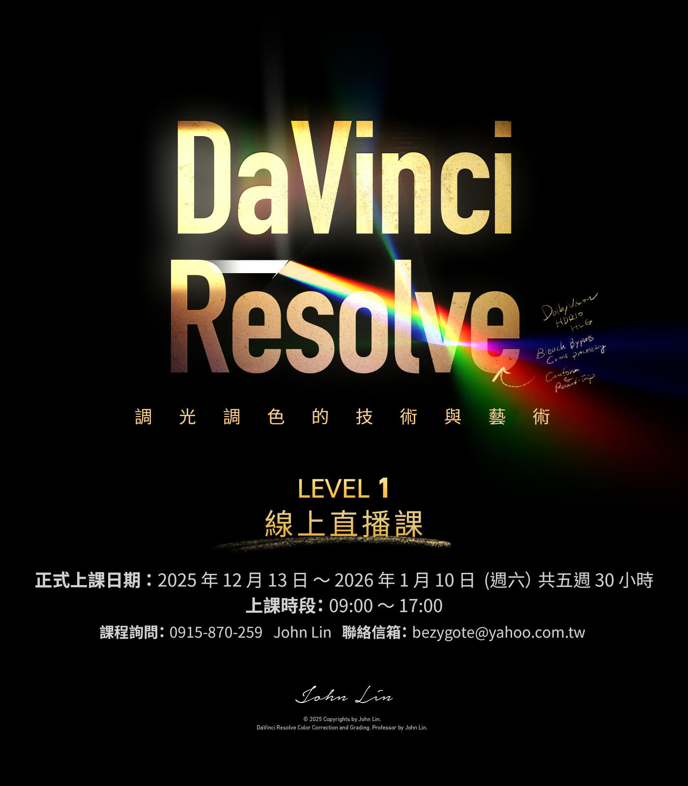 這個 DaVinci Resolve 的課程是 John 過去五年的時間裡,從全球主要的調光教育訓練與工作坊課程中,學習發展出來的一套系統化教學方式,將業界最常見的調光調色技術與藝術思考濃縮在一個 30 小時的課程內容裡。John 所發展出的課程,將會幫助每個學生在影像的專業領域上,展現成效並取得新的突破。在各個方面,由 John 所規劃的這個課程將為其所指導的學員帶來實質的成長,不僅幫助學生培養調光調色工作所需的技術與敏銳的觀察力,同時也在課程中帶給學生許多新職業發展的啓發。