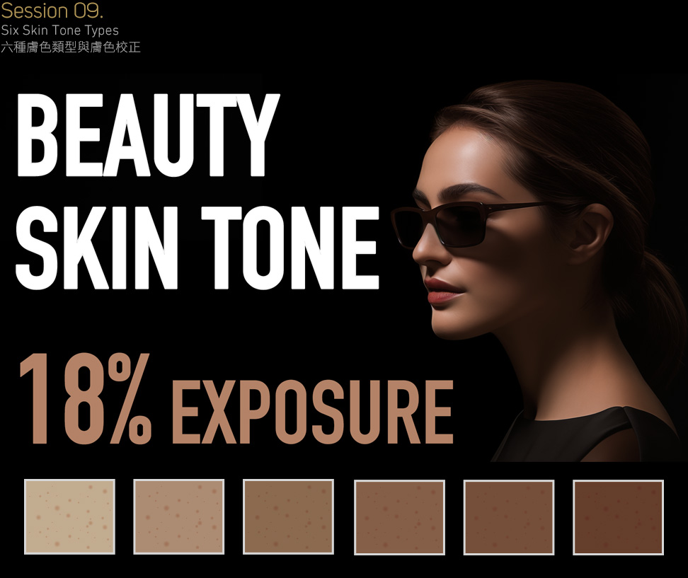在第九堂課程裡,我們把焦點專注在皮膚色調的掌控,由於膚色是調色工作最常處理的部分,因此我們必須了解影響膚色的各種原因。皮膚是半透明的,膚色實際上是顏色吸收、光線散射以及表皮、真皮與皮下組織反射的綜合結果,此外也要注意彩妝對膚色的影響。Fitzpatrick 提出人類的六大膚色 1. 白色,高加索人金髮、藍眼 2. 淺膚色的歐洲人,金髮或棕色的頭髮、淺藍色眼睛 3.深膚色的歐洲人、棕色眼睛與頭髮 4. 適中的棕色,亞洲人、黑色頭髮、咖啡色眼睛 5. 深棕色,西班牙、中東人、拉丁人、黑色頭髮、咖啡色眼睛 6. 黑色、非洲人、黑色頭髮黑色眼睛,我們將對皮膚的調色做相關的練習。此外我們將繼續探討「天空色調與植物色調」這二個膚色以外最常見的調色,天空的顏色受到太陽方位角、地球大氣層、氣候以及緯度的影響,天空的顏色是漸層的,上半部的飽和度高亮度低、下半部的飽和度低亮度高,這是光線對空氣中的細微粒子散射的結果。此外人眼在夜晚或低光源的情況下,眼睛會從感知色彩的錐狀細胞切換到感知亮度的柱狀細胞,此時色彩辨識的能力就變弱,所以在夜晚看到的每個物體都是飽和度較低的現象,對於短波長的藍綠色的認知會比長波長的紅黃色來得高